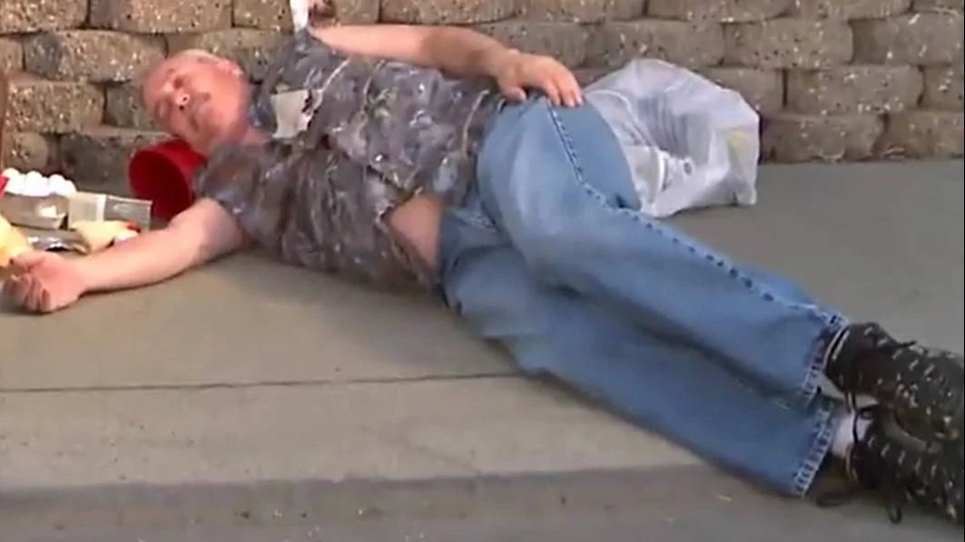 A different angle of Hobo Joe lying on the ground, having repositioned his legs.