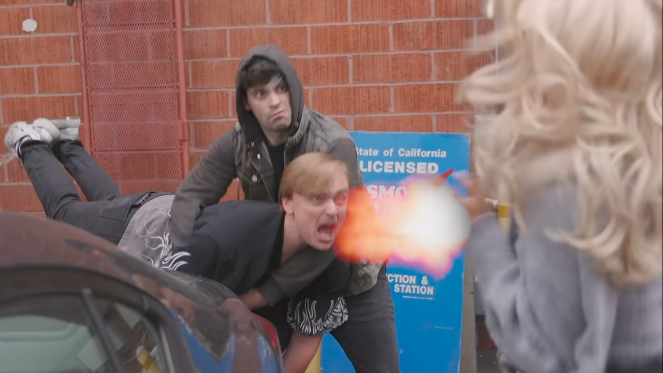 Olivia is at a gas station when a crook walks up to her and demands her purse. He pulls out Gus, carrying the comedian's body like a two-handed firearm, shooting bullets around Olivia (while Gus shouts "Bang! Bang! Bang!").