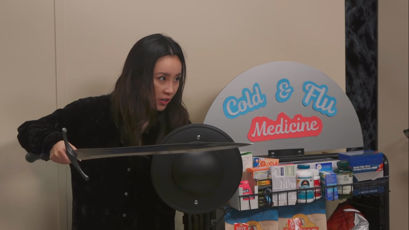 Keith is looking for some NyQuil and the store clerk points him to it, but warns that he will need to get through "her" first. The camera turns to show Safiya Nygaard holding a sword and shield in an aggressive stance, guarding the "Cold & Flu Medicine" section, and challenges Keith to try. Keith looks back at the clerk, who only shrugs.