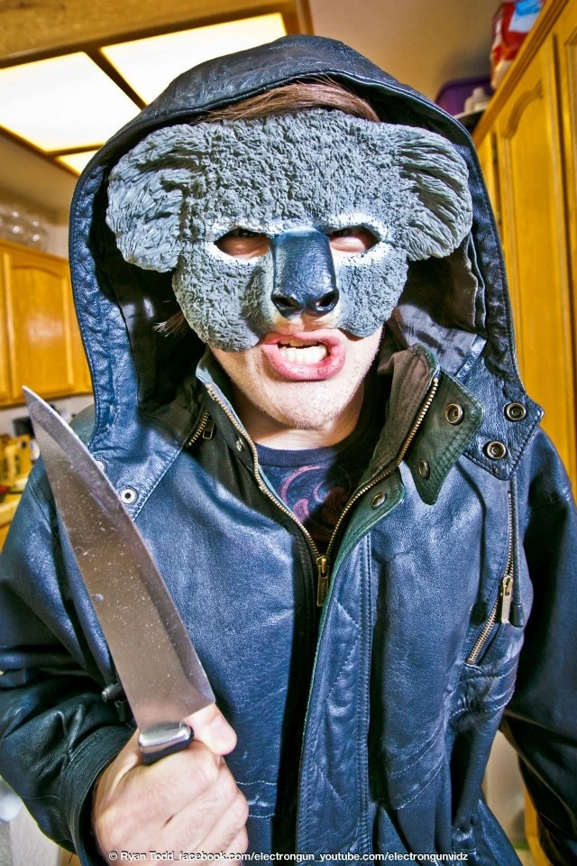 The Announcer tells people about the product and punched a guy for disliking fart jokes telling the viewers if they don't like it, they should be f**ked. Only instead of wearing a koala mask and a winter coat, he is wearing a tuxedo.